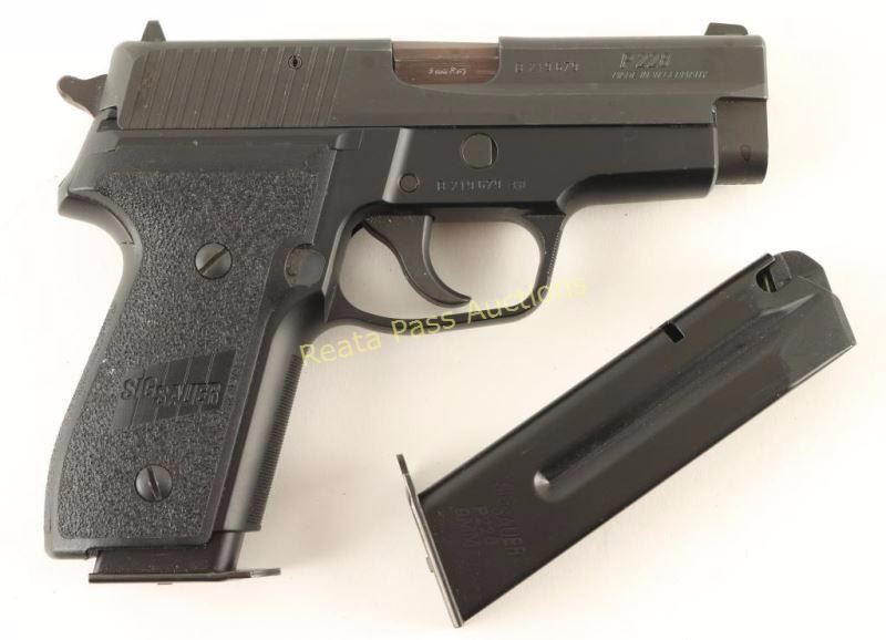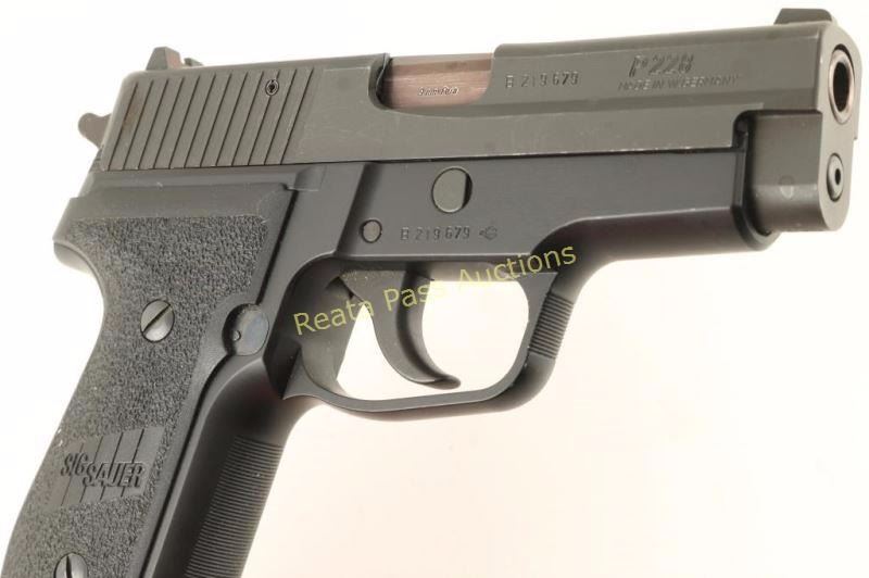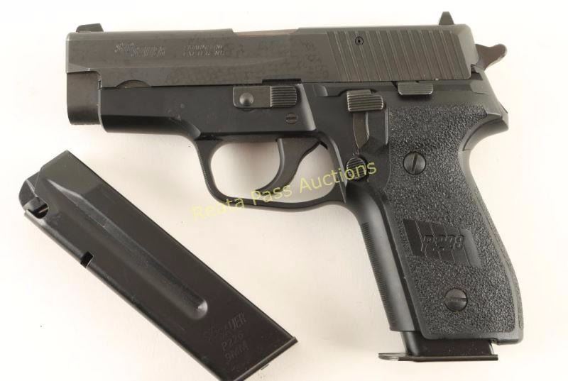 Compact German made double-action semi automatic pistol chambered in 9mm Parabellum. Features a black K-Kote finish, 3.86" blued barrel, adjustable sights, thumb de-cocker, push button magazine release, 10 round P226 magazine, smooth trigger, serrated round hammer spur and textured two-piece black synthetic grips. Includes a factory hard case with manual, five snap caps and an extra 10 round P226 magazine. Pistol exhibits approximately 96% of it's original finish showing some light edge wear, minor scuffs and a couple small spots or surface rust emerging on the slide. Action is strong, bore is excellent and synthetic grips are fine. Condition is very good++. ***Modern Firearm***