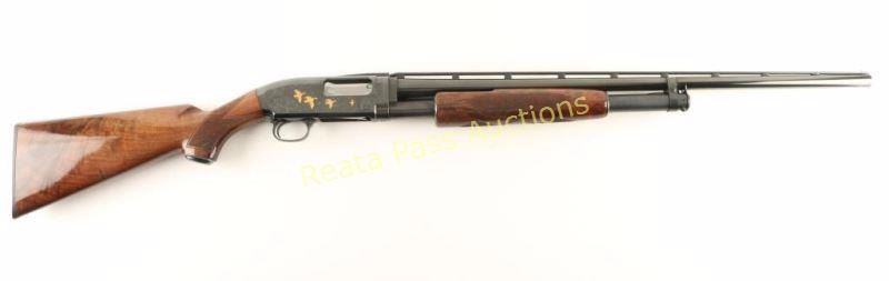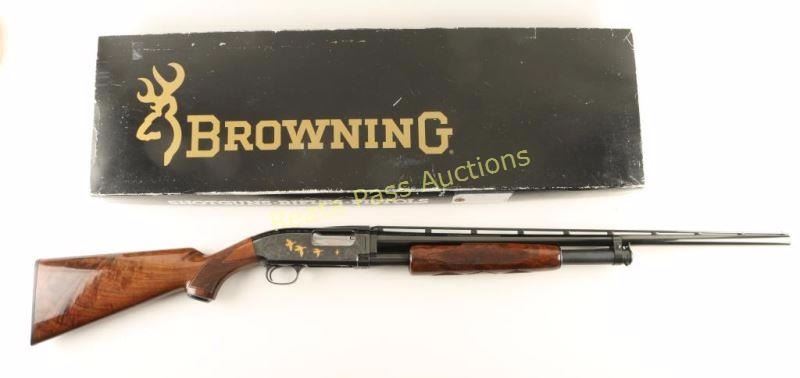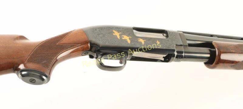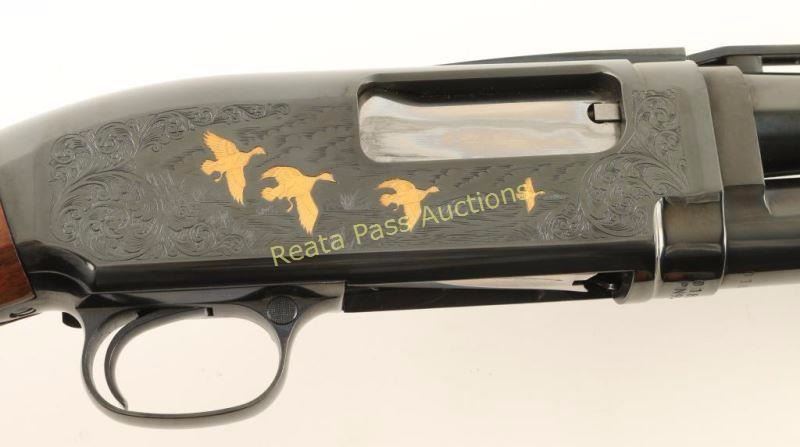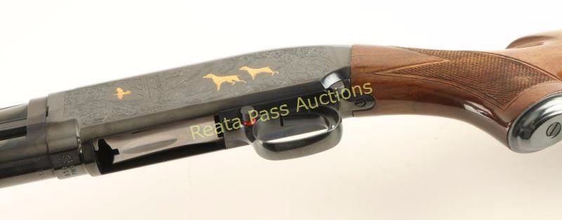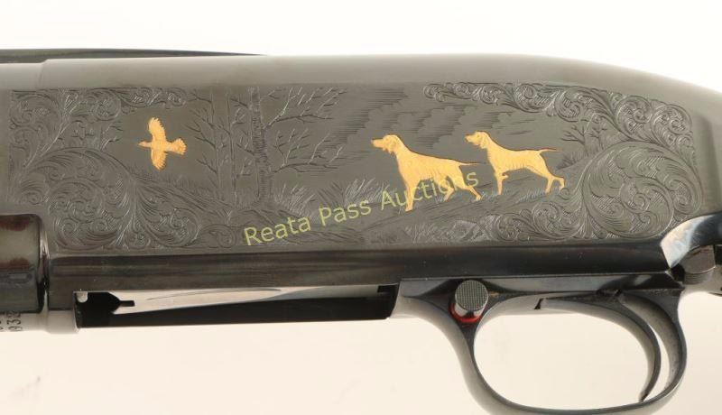 SN: 01855PN932 High grade Japanese made slide action repeating shotgun chambered for 2 3/4" 20 gauge shells, circa 1990's. Features a bright blued finish, 26" take-down barrel with raised ventilation rib & modified choke, silver bead front sight, plugged magazine tube, extensively engraved receiver with gold inlayed game scenes, smooth trigger, push button safety, polished bolt, deluxe checkered high gloss walnut slide handle and pistol grip shoulder stock with metal grip cap & factory black hard plastic buttplate. Includes the original factory box with document. Shotgun exhibits approximately 97% of it's original blued finish showing only some light drag marks on the magazine tube from being taken down. The ventilation rib is angled down towards the breach and doesn't line-up with the rib extending from the receiver. Action is smooth, bore is pristine and wood stocks are fine with a few small blemishes. Condition is near excellent in box. ***Modern Firearm***