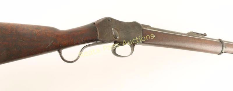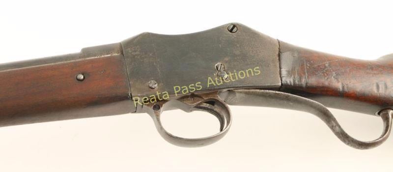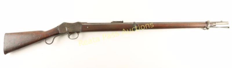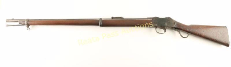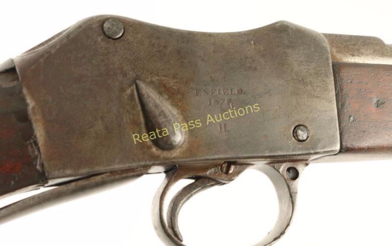 British military rolling-block single shot rifle chambered in .577-450 Martini-Henry, circa 1878. Features a blued refinish, 33.2" barrel, small blade front sight, flip-up ladder rear sight(missing cross piece), bayonet lug, cleaning rod, serrated trigger, single sling swivel, curves lever, full length wood handguard and straight grip shoulder stock with metal buttplate. Rifle exhibits good barrel markings, faint receiver markings and approximately 25% of it's blued refinish with the balance turned to a brown or grey patina showing some rust & pitting. Action is in working order, bore is very good and wood stocks are good with heavy damage at the wrist & numerous blemishes to the shoulder stock. Condition is good. ***Antique Firearm***