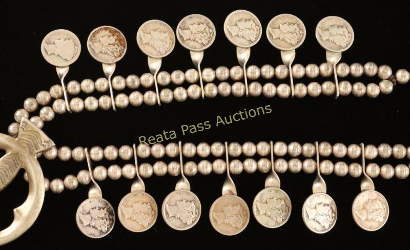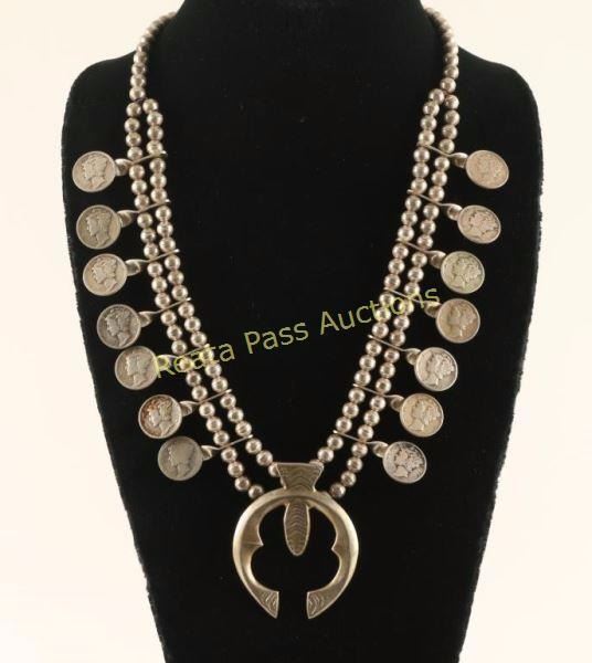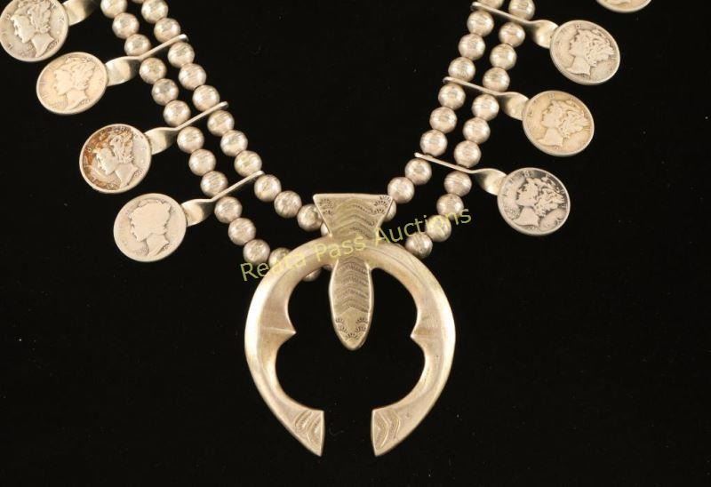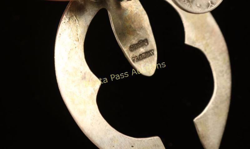 14 total dimes with a fish shaped base for a moon shaped naja. A truly unique presentation. Marked 'Sterling' and 'FL Begay'.
