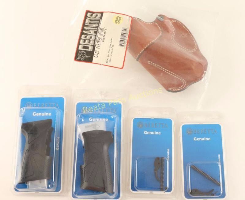 Including; 2 Steel Triggers and Springs, 2 Slim Grips with Block, and a Desantis Cozy Partner right hand holster in saddle tan.