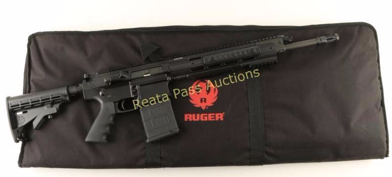 Quality two-stage piston-driven AR-style semi-automatic rifle chambered in 7.62mm NATO, circa 2014. Features a matte black finish, cold hammer-forged 16.12" chrome lined fluted barrel, birdcage-style flash hider, no sights, four-position chrome-plated gas regulator, Ruger smooth-side forend with multi-rail capabilities, chrome-plated BCG, 20 round Pmag, shell deflector, forward assist, 4.5lb two-stage trigger, Ruger black rubber over-molded pistol grip and Ruger black synthetic six-position collapsible shoulder stock. Includes a padded soft case with two extra 20 round Pmags. Rifle exhibits little to use or wear. Action is crisp, bore is pristine and stocks are fine. Condition is excellent. ***Modern Firearm***