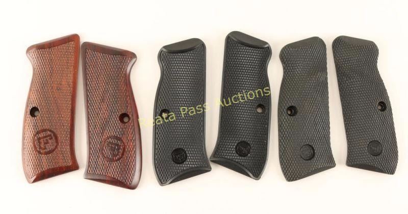 All checkered grips for CZ 75, brown wood, black rubber and black plastic.