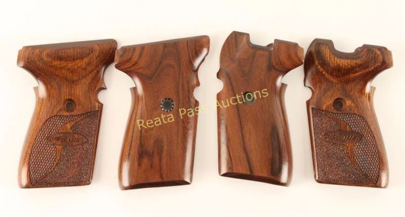 Sig 239 in dark wood, one has textured grip with 'Sig Sauer' on both sides.