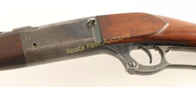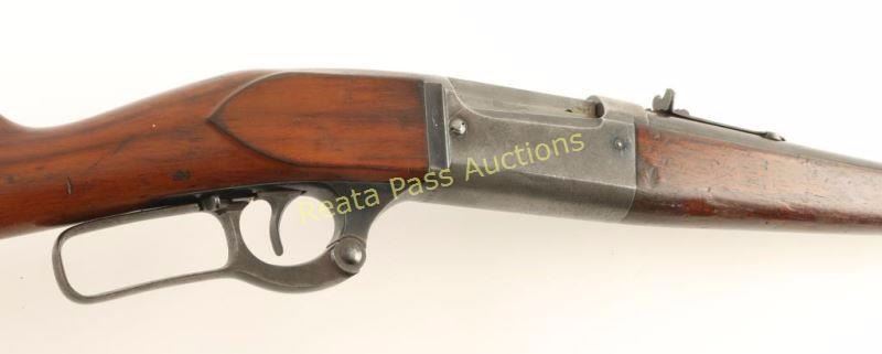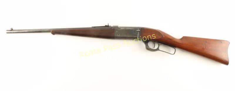 'SRC' Vintage lever-action repeating rifle chambered in .25-35 Winchester, circa 1912. Featured a blued finish, 20" barrel, Lyman blade front sight, adjustable buckhorn rear sight, internal rotary magazine with round counter, case hardened lever, smooth trigger, cocked indicator, removed saddle ring, manual safety, smooth walnut schnabel forend and straight grip shoulder stock with metal carbine buttplate. Rifle exhibits approximately 20% of it's original blued finish overall with the barrel turning to patina and the receiver showing heavy oxidation on it's underside. Action is smooth, bore appears semi-dull with good rifling and wood stocks are good with cracks extending from the buttplate at the heel, small scattered losses & many small blemishes. Condition is good+. ***C&R Firearm*** ***Modern Firearm***