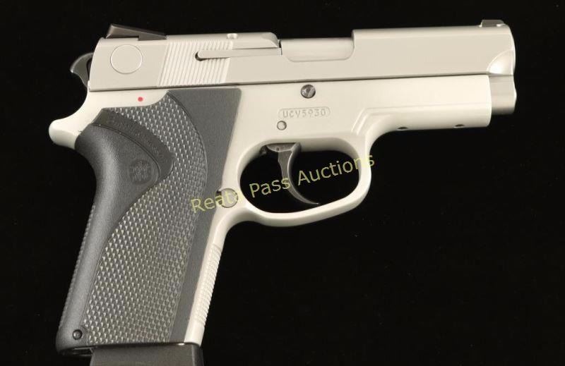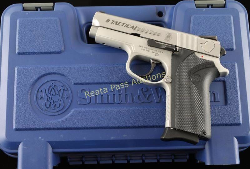 '9 Tactical' Compact double action only semi-automatic pistol chambered in 9mm. Features a satin finished stainless steel slide, 3.5" barrel, dovetailed white dot front sight, Novak Lo-Mount carry two-dot rear sight, alloy frame drilled to accept an accessory rail, .260" semi-bobbed hammer, .305" combat trigger, push button magazine release, 8 round factory magazine, and Smith & Wesson one-piece checkered black plastic wrap-around grips. Includes the original factory hard case with documents, lock and accessory rail. Pistol exhibits light wear with only slide marks on the barrel and edge wear on the sights observed. Action is strong, bore is excellent and grips are fine. Condition is near excellent. ***Modern Firearm***