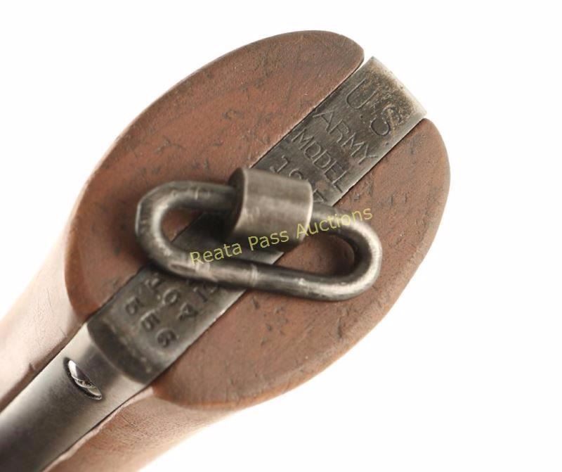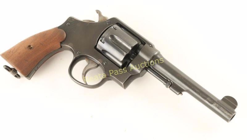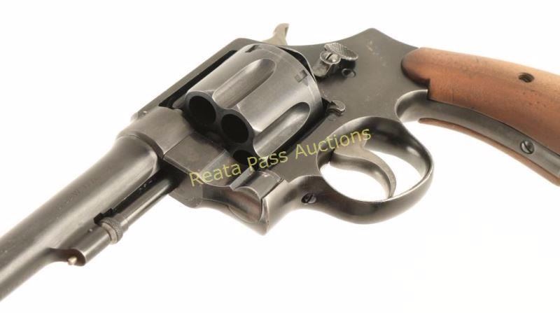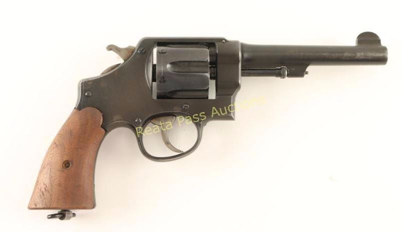 Refinished U.S. Military marked double-action service revolver chambered in .45 Auto, circa 1918. Features a fully blued finish, pinned 5.5" barrel marked "UNITED STATES PROPERTY," forged round blade front sight, notched rear sight, non-shrouded ejector rod, fluted six-shot cylinder, smooth service hammer. checkered hammer spur, lanyard ring and two-piece smooth walnut grips. The square butt is marked "U.S. ARMY MODEL 1917", all serial numbers match and various Eagle Head/S proof marks are observed: S2 on barrel & yolk and a S1 on the frame. Revolver retains approximately 84% of it's blued refinish showing some storage/handling wear on the barrel and some other small scattered losses. Action is smooth with a solid lock-up, marking are mostly good, bore is excellent and wood grips are very good but possibly reproduction. Condition is very good as refinished. ***C&R Firearm*** ***Modern Firearm***