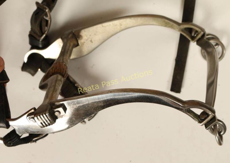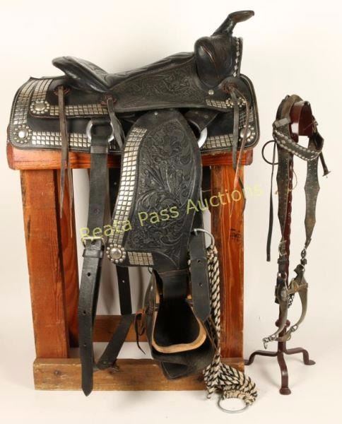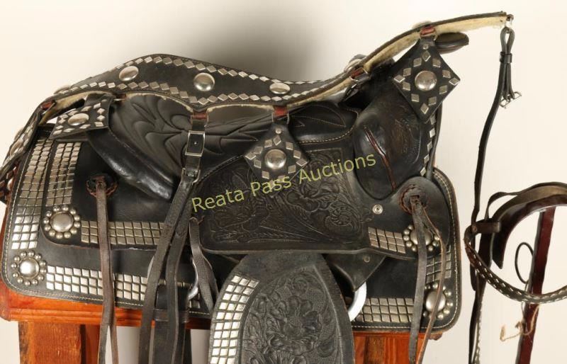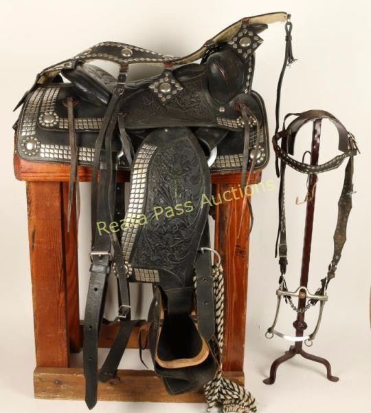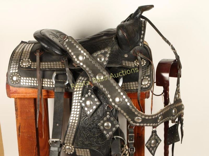 14" seat with headstall that has a cavesson bit and a breast collar. Includes front and rear cinches and leather tapaderos. Black with a square skirt and nickel spotted diamond grommet design accented with floral tooled design. Marked '250' on rear behind seat. Good condition overall.