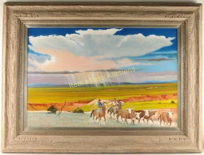 "Reason to Be a Cowboy" by Austin Duval, signed lower left. Depicting cowboys herding cattle with a rainstorm in the background. Image measures 35 1/4"x23 1/4" with silver insert and large driftwood frame.