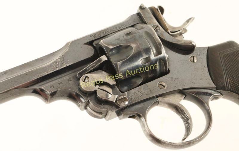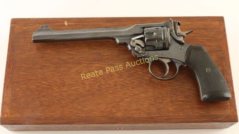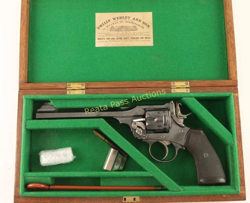 Cased double-action revolver manufactured by P. Webley & Son, circa 1904. Features a high polish blued finish, 7 1/2" octagonal barrel with sighting rib, pinned patridge front sight, drift adjustable target rear sight, fluted six shot cylinder, wide checkered trigger, removed lanyard ring, dry-firing hammer attachment, and two piece finely checkered walnut grips. Includes a British style oak display case with vintage PHILIP WEBLEY AND SON interior label, green baize lining, and four compartments with houses a rubbed coated brass cleaning rod, brass cleaning rod jag, nickel-plated front sight cover & a key. The barrel rib is marked "P. WEBLEY & SON. LONDON & BIRMINGHAM." and the left side of the top strap is marked ""WS" TARGET MODEL". The left side of the frame is marked "WEBLEY PATENTS" with a winged bullet trademark below the cylinder and a 'broad arrow' is found on the left side of the hammer. The barrel lug is marked with a crown/NP, crown/BP & crown/BV. The crown/BV can also be found on the left side frame and the crown/BP & crown/BV can be found on the cylinder. Serial number 447035 is stamped on the right side of the frame and the number 035 is stamped on both the barrel & the rear face of the cylinder. Revolver retains approximately 70% of it's original commercial blue finish showing moderate handling wear, vice marks on both sides of the barrel, and high point edge wear. The grip frame and trigger guard exhibits higher wear with these areas turned to a light grey patina. Action is sound with solid lock-up, bore is excellent and walnut stocks are good with worn checkering, a repair to the top of the right panel & some light dings to the bottom of the grips. Condition is very fine. ***C&R Firearm*** ***Modern Firearm***