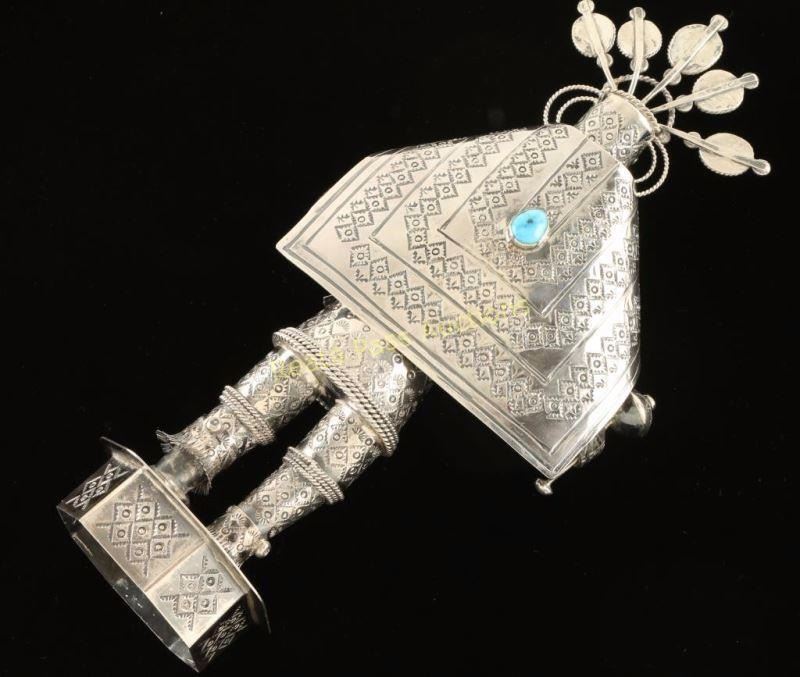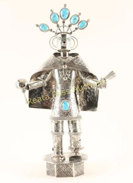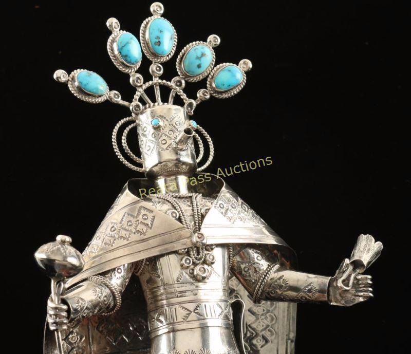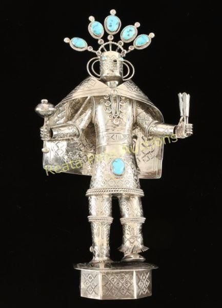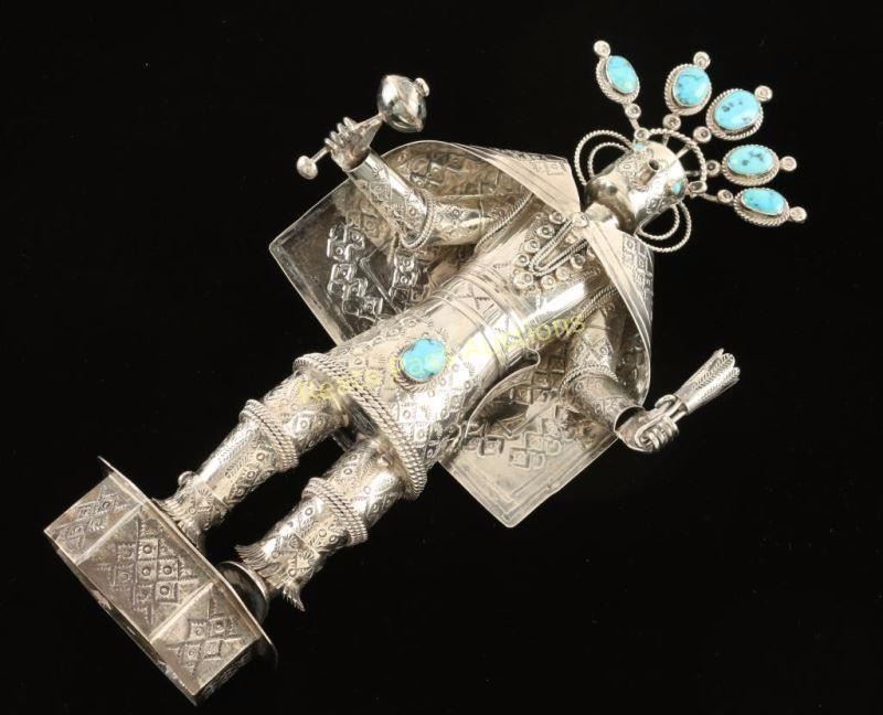 Navajo Sunface Kachina. Marked on bottom TH Navajo Sterling Silver. 12"TX 6" wide, head is removable, cape is a separate piece, ankle pieces move, and rattle is removable. Excellent condition and just a stunning piece