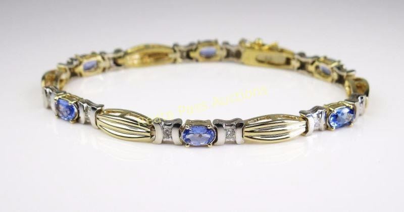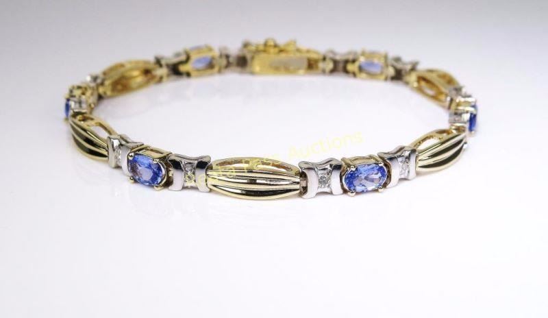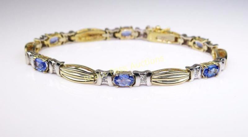Set with six oval Tanzanites weighing approx. 3.50 – 4.00 carats accented with 12 ‘IDEAL’ cut diamonds weighing approx. 0.30 carats of G-H colors and VS clarity set in 14 karat two-tone gold. Retail $3,000-$4,000