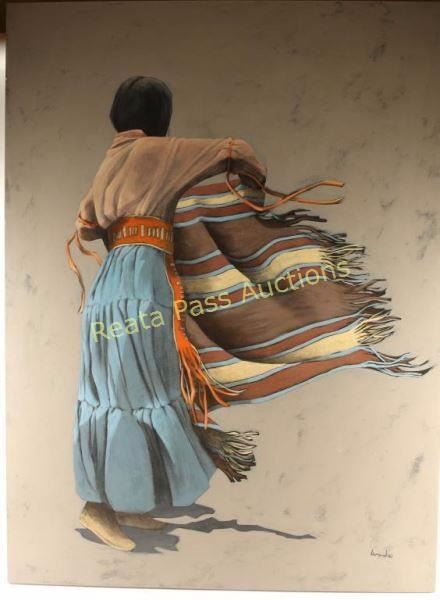 "Windy Morning" by Mary E Wyant. Depicting back view of woman in native dress holding a striped shawl that is blowing in the wind. Signed by artist lower right. Measures 40"x54". Mary E. Wyant was born in 1939 and received two degrees in design at Wayne State University in Detroit. She moved to Tucson, Arizona to teach Interior Design at the University of Arizona. In 1982, she met Lawrence W. Lee who became her mentor and later her husband.