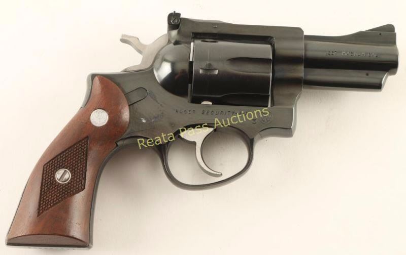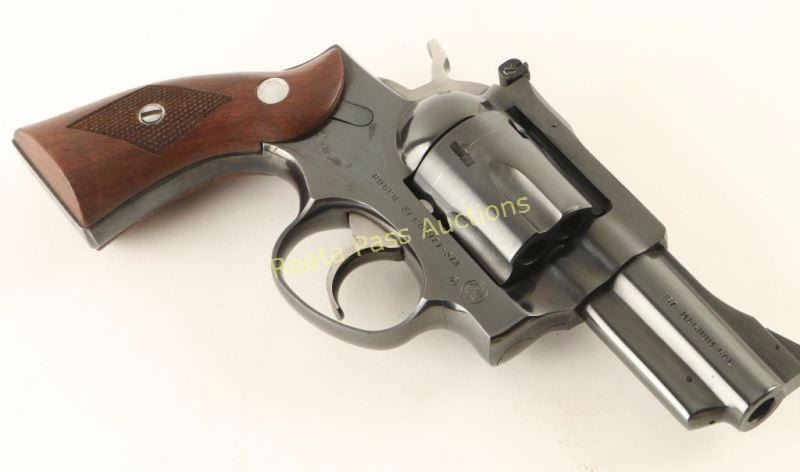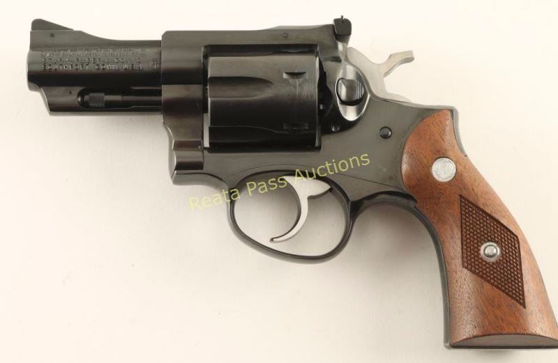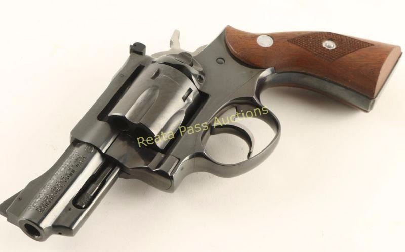 Double action snub-nosed revolver chambered in .357 Magnum, circa 1980. Features a blued finish, 2 3/4" ribbed barrel, shrouded ejector rod, ramped & pinned patridge front sight, adjustable rear window sight, fluted six-shot cylinder, smooth trigger, checkered hammer spur, and Ruger medallion two-piece checkered wood grips. Revolver exhibits approximately 96% of it's blued finish showing a light drag line and a few small scattered losses on the backstrap & frame. Action is sound with solid lock-up, bore is very good with what appears to be lead between the lands just forward of the chambers and the wood grips are excellent. Condition is near excellent. ***Modern Firearm***