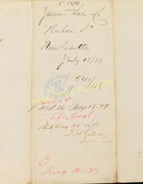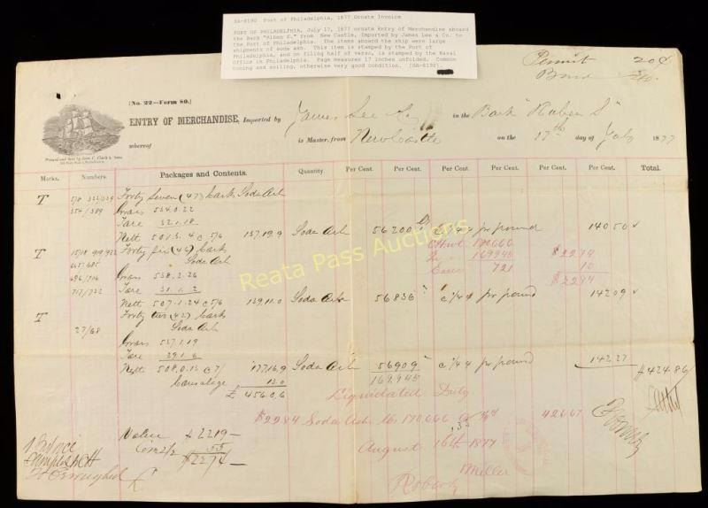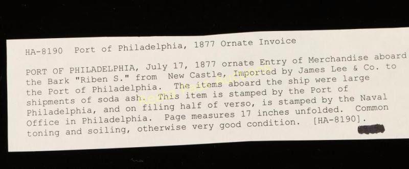 July 17, 1877 ornate Entry of Merchandise aboard the Bark "Riben S." from New Castle, Imported by James Lee & Co. to the Port of Philadelphia. The items aboard the ship were large shipments of soda ash. This item is stamped by the Port of Philadelphia, and on filing half of verso, is stamped by the Naval Office in Philadelphia. Page measures 17" unfolded. Common toning and soiling, otherwise very good condition.