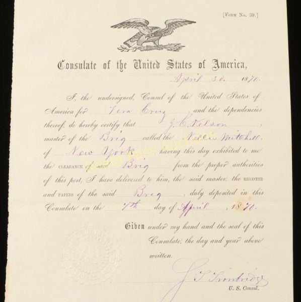 Veracrus, Mexico. Reads: [Form No. 39.] Consulate of the United States of America, April 30. 1870. I, the undersigned, Consul of the United States of America for Vera... Signed and sealed.
