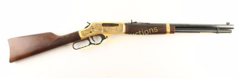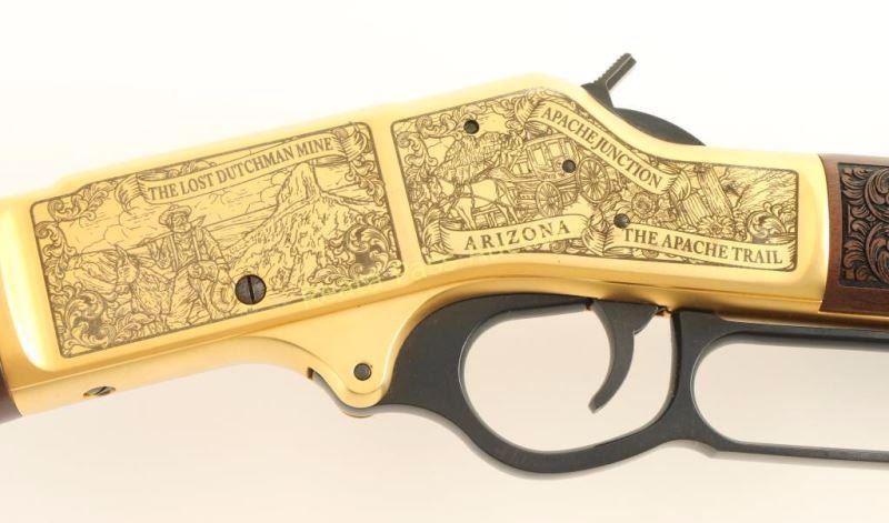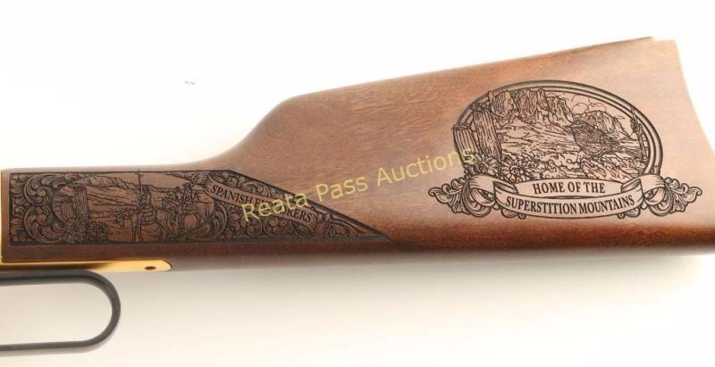 Model H009B SN: TTB031018 'Apache Junction, AZ Heritage Series' Heavily embellished lever-action repeating rifle chambered in .30-30 Winchester. This rifle is number one in a very limited run of twenty-five done by American Legacy Firearms Inc. to celebrate A. J. for it's rich cultural heritage. Features elaborate engraving, 24kt gold plating, blued 20" octagonal barrel, full length 5-round tube magazine, blade front sight with gold bead, adjustable buckhorn rear sight, drilled & tapped receiver with "The Lost Dutchman Mine", "The Apache Trail", "Film Industry" & "Ghosttown of Goldfield" scenes, smooth trigger, serrated hammer spur, laser engraved American Walnut forend with "1 of 25" & Arizona landscape scenes and a straight grip shoulder stock with "Spanish Explorers" & Renaissance Faire" scenes. Includes the original cardboard box with factory documents and a certificate of authenticity from A.L.F. Inc. certifying this particular rifle as number one of twenty-five. Rifle exhibits approximately 99%+ of it's blued & gold plated finish showing no visible wear. Action is smooth, bore is pristine and wood stocks are extra fine. Theses rifles retailed for $2,500 new. Condition is like new in box. ***Modern Firearm***