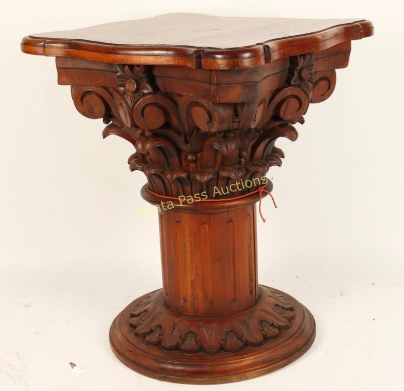Corinthian style column pedestal with floral and leaf details and a rounded edge top. Bottom of table has more leaf designs with a circular base. Measures 30"x23 1/2"x23 1/2". A conversation piece in any room.