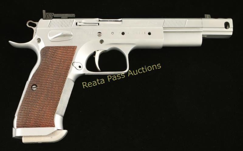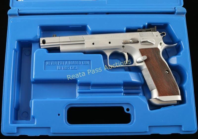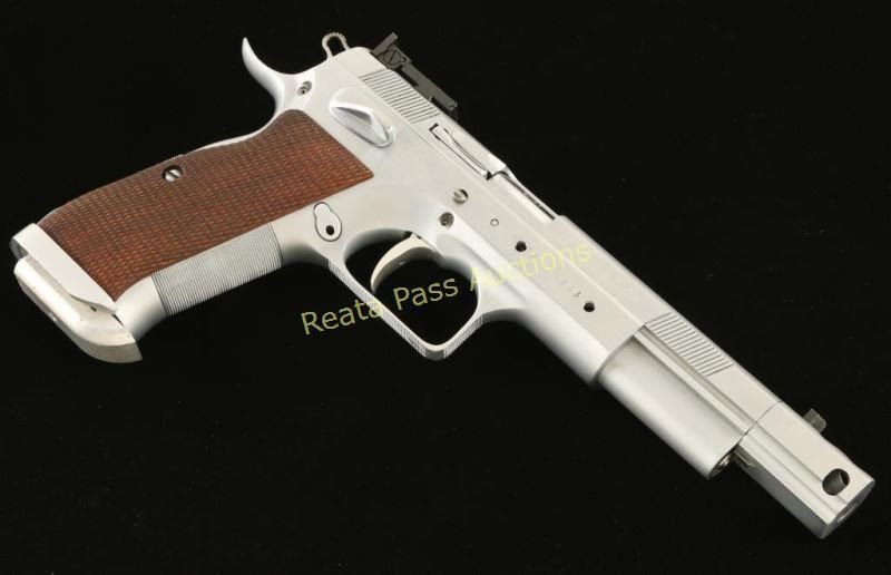 Les Baer customized stainless steel semi-automatic race pistol chambered in 9x21mm, circa 1992. Features a brushed & satin finish, 5.5" barrel with compensator, patridge front sight, Bo-Mar adjustable rear sight, smooth target trigger, skeletonized hammer, beveled magazine well, drilled & tapped frame, push button magazine release, 18 round magazine checkered grip straps, ambidextrous safety, beavertail frame and two-piece checkered wood grips. Includes a factory hard case with manual, documents, and an extra trigger. Pistol shows very little wear with some light marks on the frame from a scope base install. Action is very smooth, bore is excellent and grips are very good+. Condition is near excellent. ***Modern Firearm***
