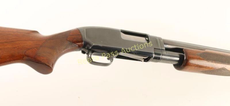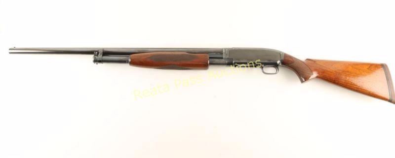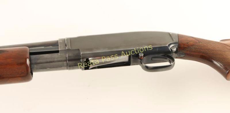 Vintage take-down slide action repeating shotgun chambered for 2 3/4" 12 gauge shells, circa 1916. Features a blued finish, 28" Improved Cylinder choke barrel with solid rib, white bead front sight, small silver middle sight, 1/2 length tube magazine, smooth trigger, push button safety, checkered walnut slide handle and pistol grip shoulder stock with factory recoil pad. Shotgun exhibits approximately 85% of it's original finish showing light scratches on the receiver, edge wear, slide marks on the magazine tube and finish loss on the take-down portion of the barrel. Action is smooth, bore is excellent and wood stocks are near fine with a slightly ill-fitting recoil pad. Condition is very good+. ***C&R Firearm*** ***Modern Firearm***