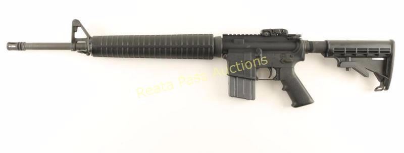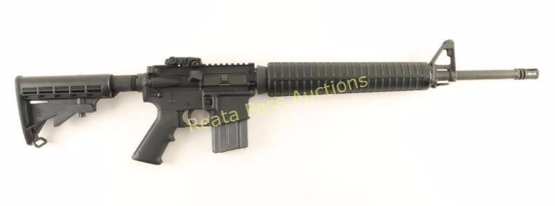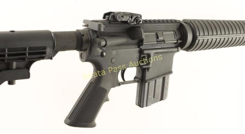 Gas-operated semi automatic AR-15 platform sporting rifle chambered in 5.56mm NATO. Features a 20" semi-heavy barrel with bird cage style flash hider, adjustable A2 winged front sight without bayonet lug, unmarked flat top receiver, Magpul MBUS flip-up rear aperture sight, rifle length hand guard, 'half-moon' BCG, sear block, 20 round factory magazine, checkered black plastic A2 style pistol grip, manual safety, sling swivels and black synthetic collapsible shoulder stock. Finish shows only minor scuffs from handling & storage with no major wear observed. Markings are crisp, action is sound, bore is excellent, and stocks are fine. Condition is excellent. ***Modern Firearm***
