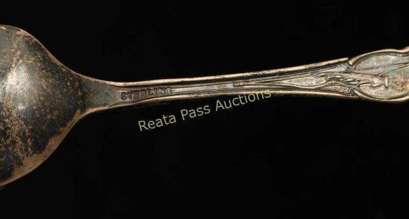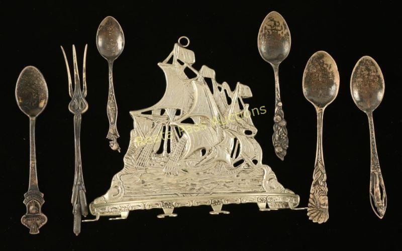Silver metal rack depicting a schooner with six slots to hold spoons. Includes 5 different collector spoons-three Native American theme, one floral, and one Rolex Watches and a cattail seafood fork.
