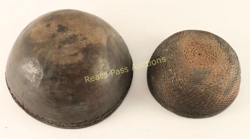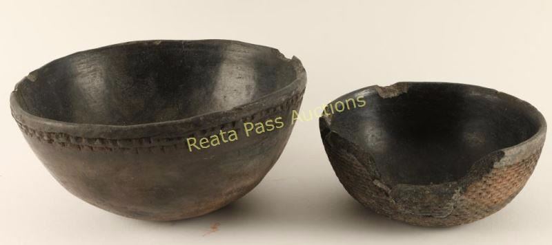 Large bowl with textured design on rim measures 4"h x 8"dia. and small textured bowl measuring 2 1/2"h x 6"dia. Both have chips and cracks and small bowl has some pieces missing.