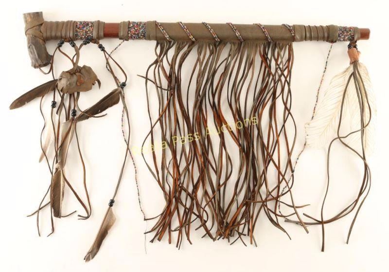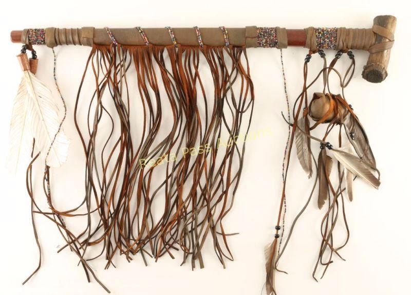 Leather wrapped with trade bead decoration with fringe and feather accents and an antler bowl. 25 1/2" long