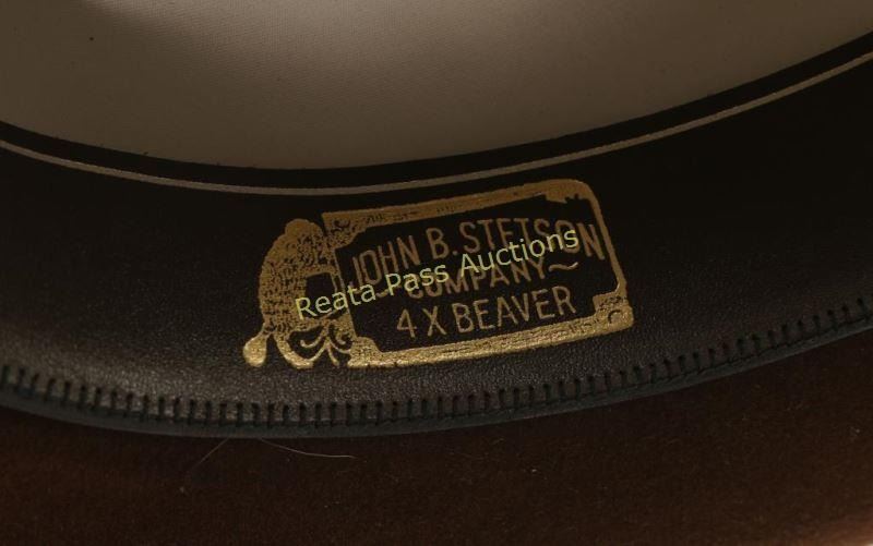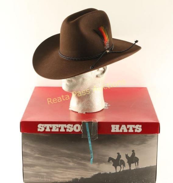 Stetson 4X Beaver size 7. Cuerda style in chocolate brown. Braided leather hatband with feather accent. Excellent condition in box.