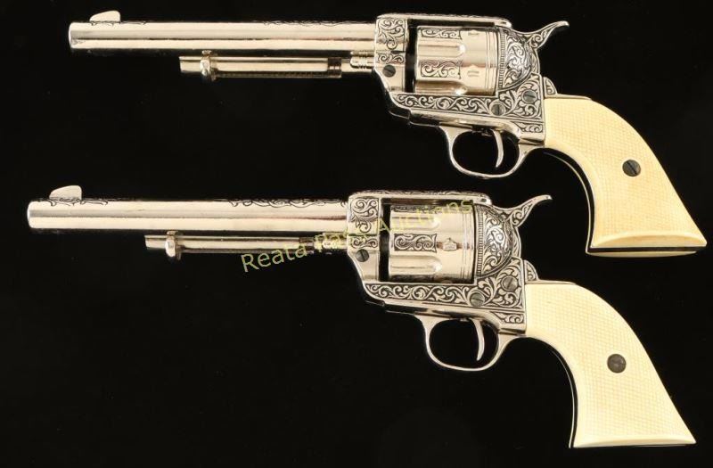 Engraving and faux ivory grips, nickel finish. Beautiful non gun replicas.