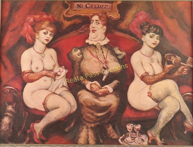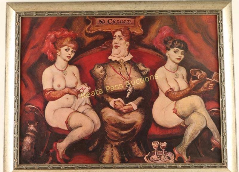 Depicting a madam and two prostitutes. Unsigned in pewter frame. Image measures 23 1/2"x17".