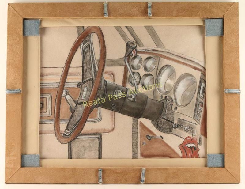 Depicting the interior of a '77 Chevy pickup, unsigned. Image measures 22 1/4"x17 3/4" in interesting handcrafted frame using denim, suede and leather.