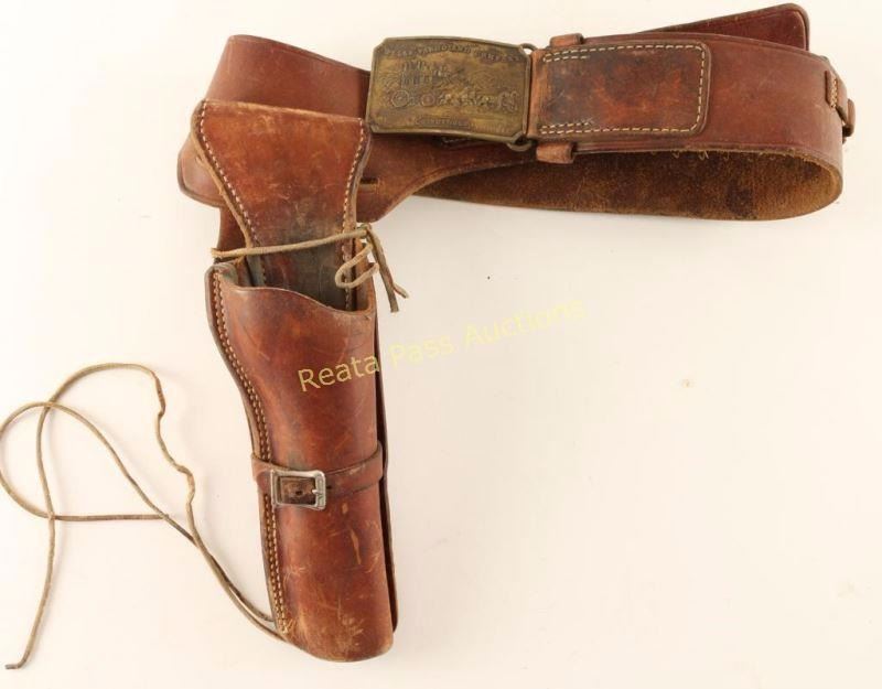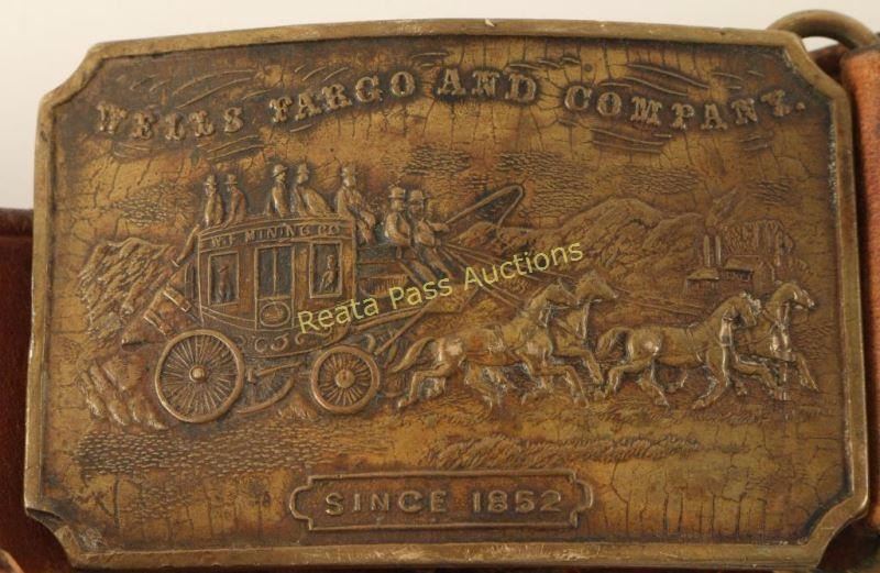 Smooth brown leather with a brass Wells Fargo belt buckle marked 'Tiffany NY', repro. Fits a 36" waist.