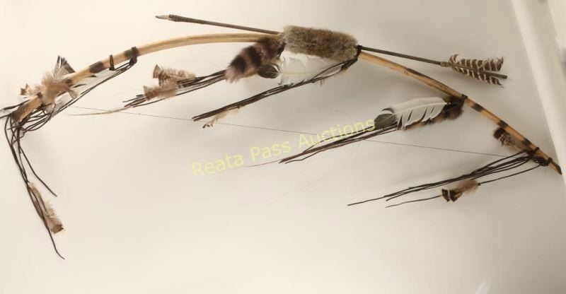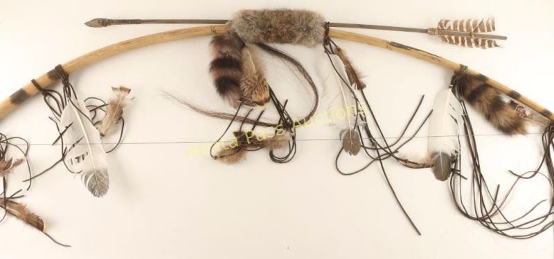 Native American design wooden bow with fur, feather, leather and bead accents that has a single arrow mounted on top. Measures 57" l x 13" w great wall hanger.