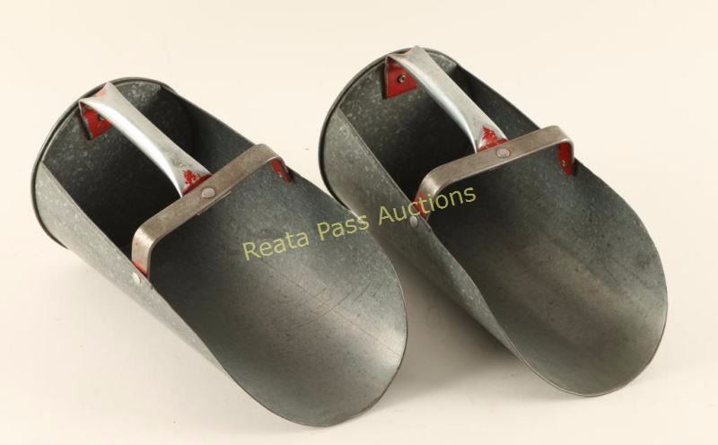 All metal construction cylinder scoops with handles. Measure 10"x5"dia. ends read "superior ball Our name says it all". Red paint has worn off handles otherwise good.