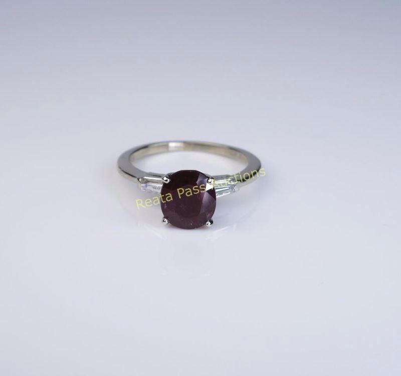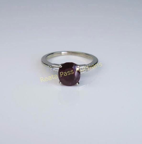 featuring a cushion cut ruby weighing 2.50 carats accented by two side baguette cut diamonds weighing approx. 0.30 carats with F-G colors and VVS clarity in a 14 white gold setting. Retail $2,000-$3,000