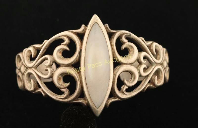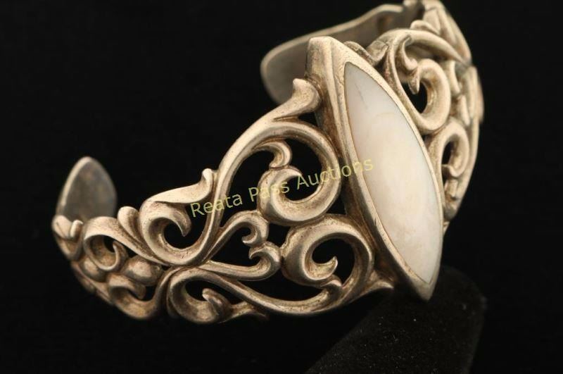 Pointed oval center with mother of pearl inlay. Sides of bracelet are openwork scrolls with a heart design. Marked 'Ster'.