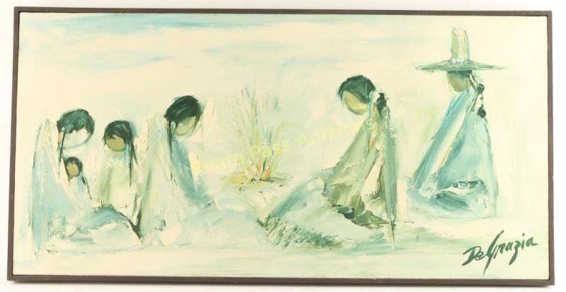 DeGrazia print depicting a Native family around a campfire. Image measures 29 3/4" x 14 3/4" in black wood frame. 'Ettore "Ted" DeGrazia was an American impressionist, painter, sculptor, composer, actor, director, designer, architect, jeweler, and lithographer. Described as "the world's most reproduced artist", DeGrazia is known for his colorful images of Native American children of the American Southwest and other Western scenes. DeGrazia also painted several series of exhibitions like the Papago Legends, Padre Kino, and Cabeza de Vaca.-Wikipedia