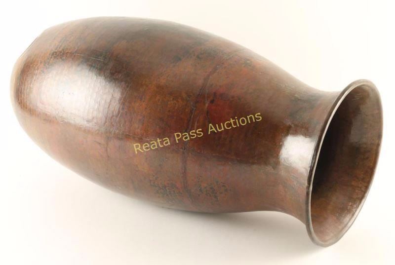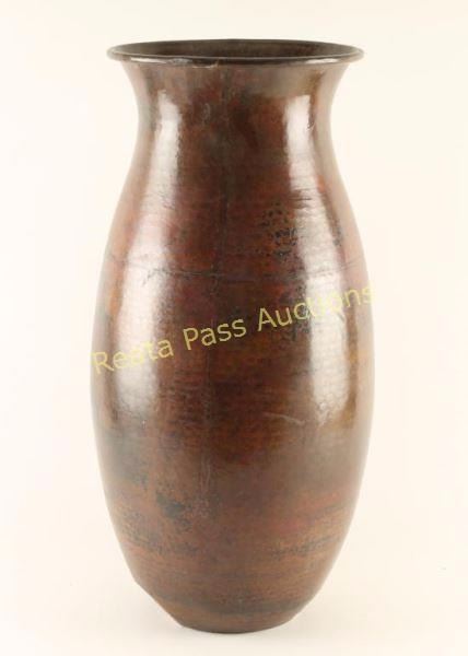 Urn shaped pot with beautiful variations of pink, copper and black throughout the hand hammered surface. Measures 23 1/2"h x 9 3/4" dia. Nice addition to any decor.