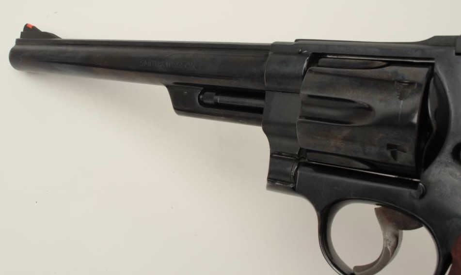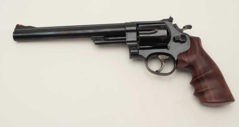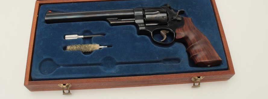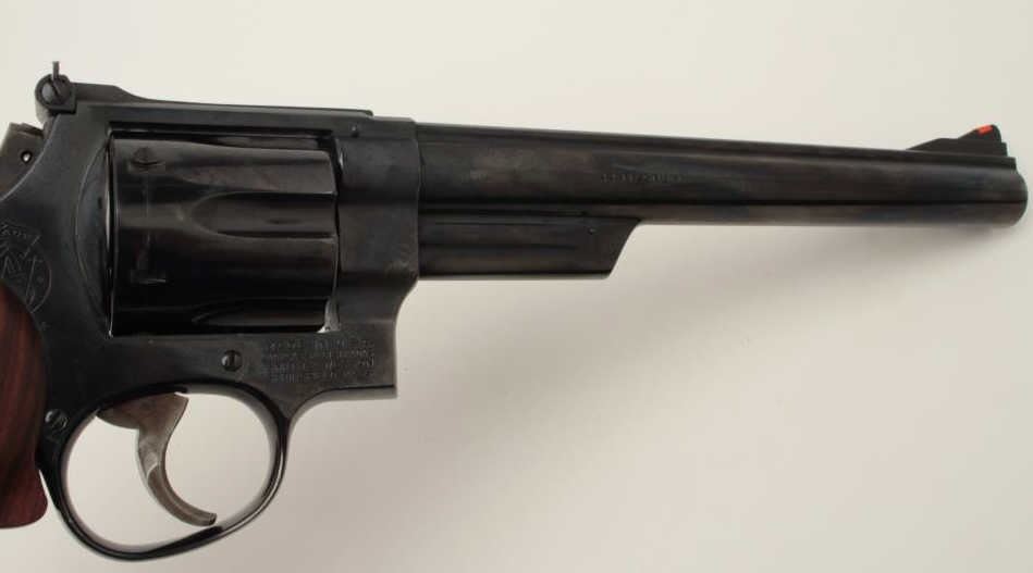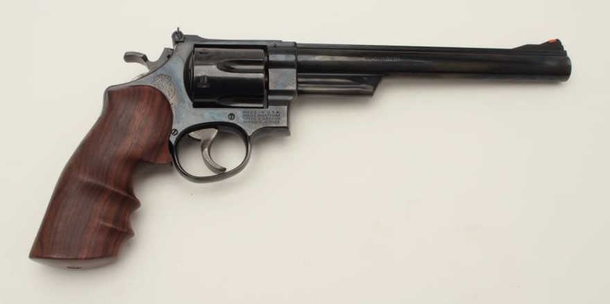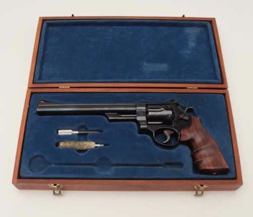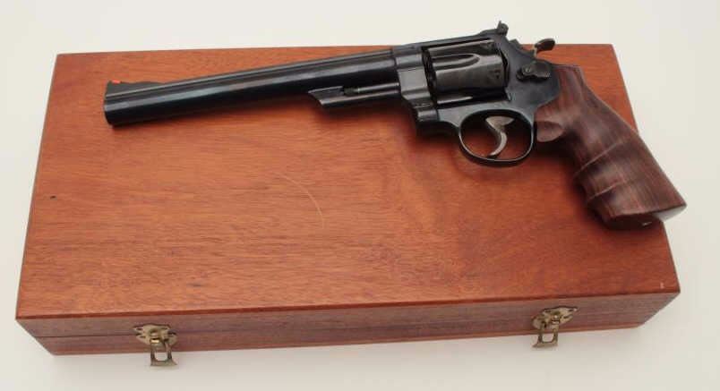 Smith & Wesson Model 629-2 DA revolver, .44 Magnum caliber, 8.375” pinned barrel, blued finish, target hammer and trigger, finger groove custom hardwood grips, S/N N619559, in overall excellent condition and contained in a factory wood case with factory screwdriver and cleaning brush (cleaning rod missing). (Modern/PPT). Est.: $500-$1,000.