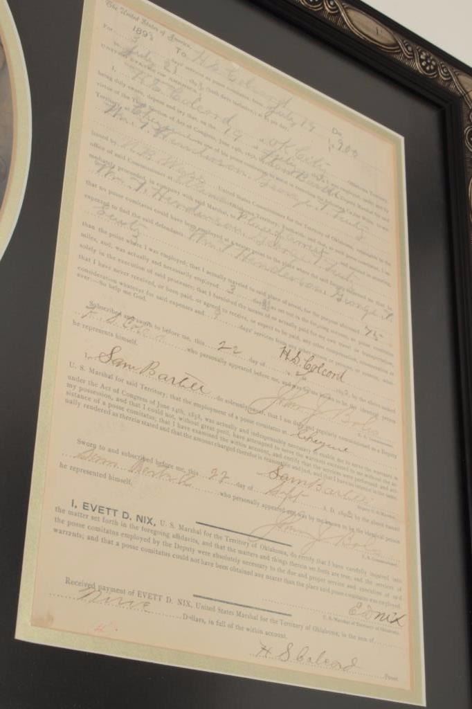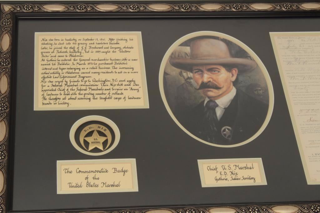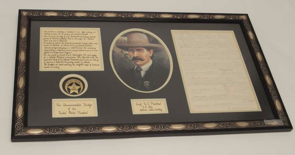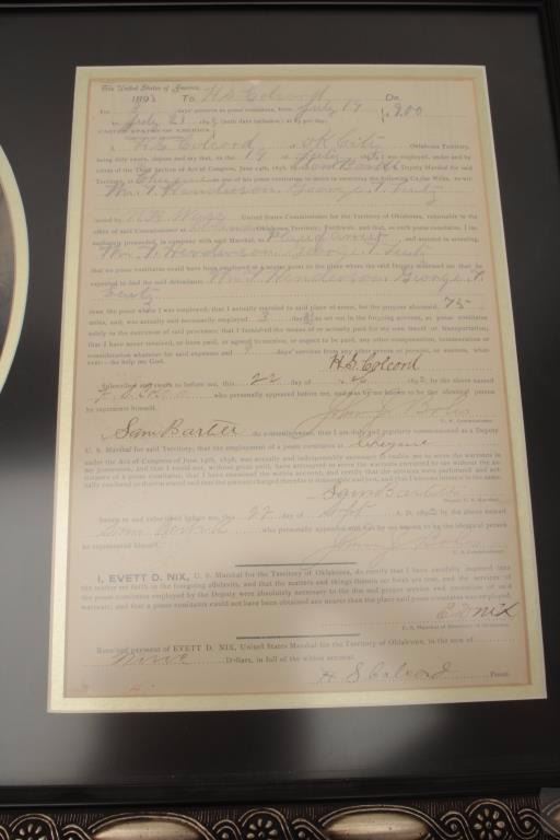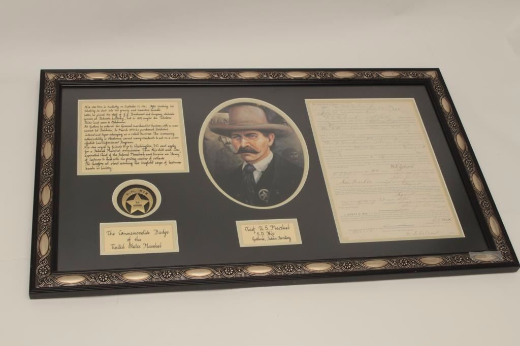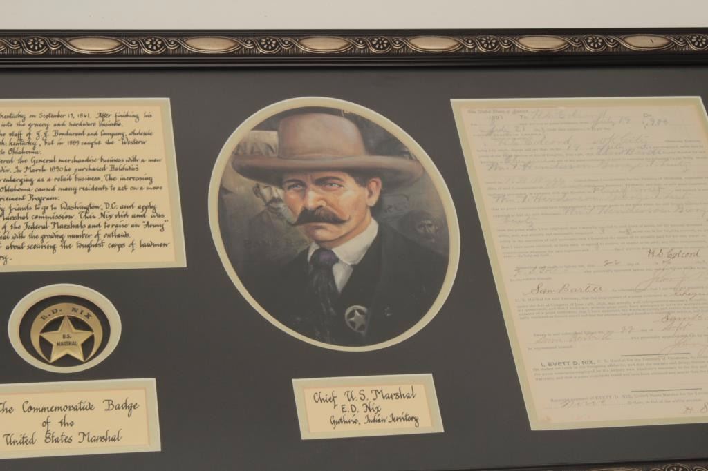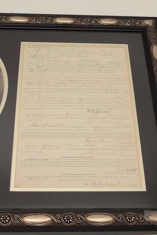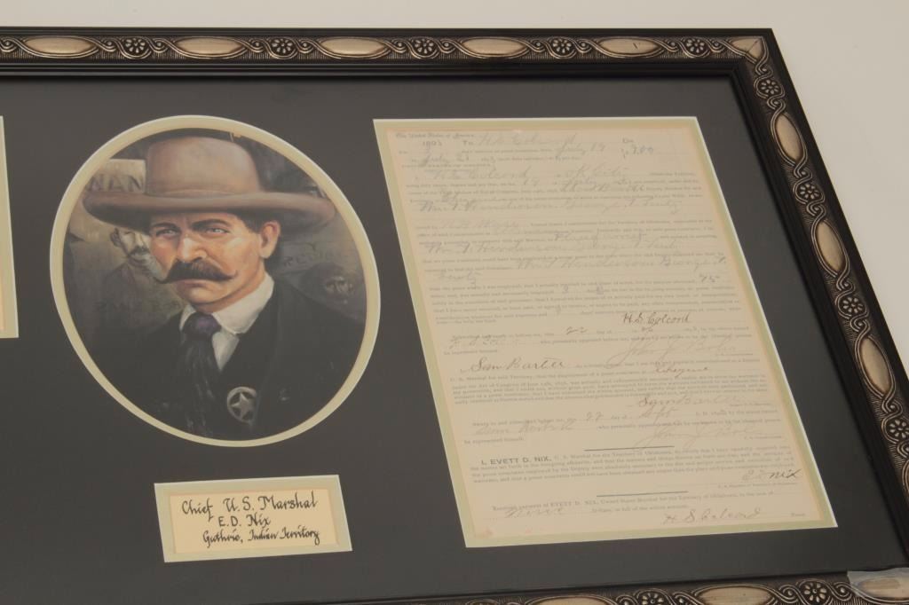 Framed and matted original Court document signed by legendary U.S. Marshal E.D. Nix for the Territory of Oklahoma, dated 1893, approximately 18.5” x 35.5” overall including a commemorative crescent starbadge, a color portrait of Nix and brief historical note on Nix’s career. The Marshal oversaw the cleaning up of the Oklahoma Territory outlaw element and supervised “The Three Guardsmen”; Bill Tilghman, ChrisMadsen and Heck Thomas, Deputy U.S. Marshals famous for their ethics, bravery and productive efforts in bringing in many of the most hardened outlaws committing crimes against the citizenry at the turn-of-the 19th to 20th Century. A great piece of early law enforcement ephemera! Est.: $500-$1,000.