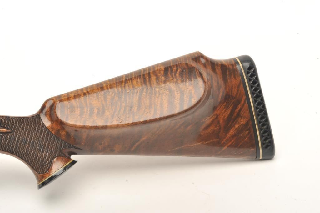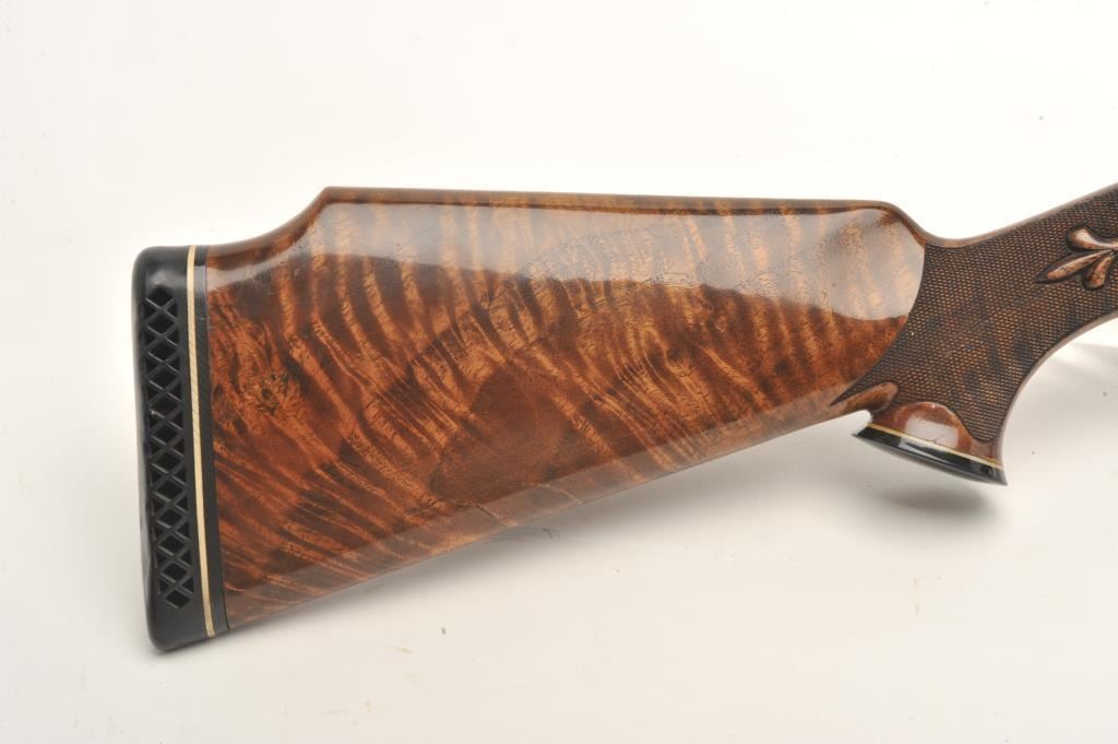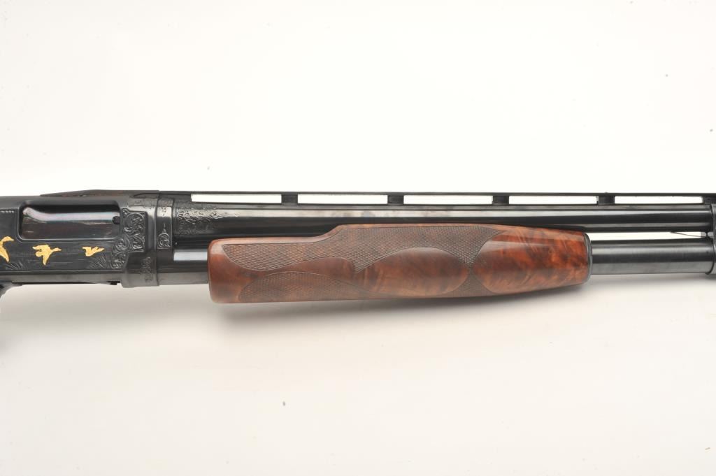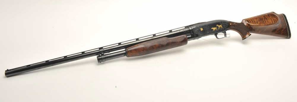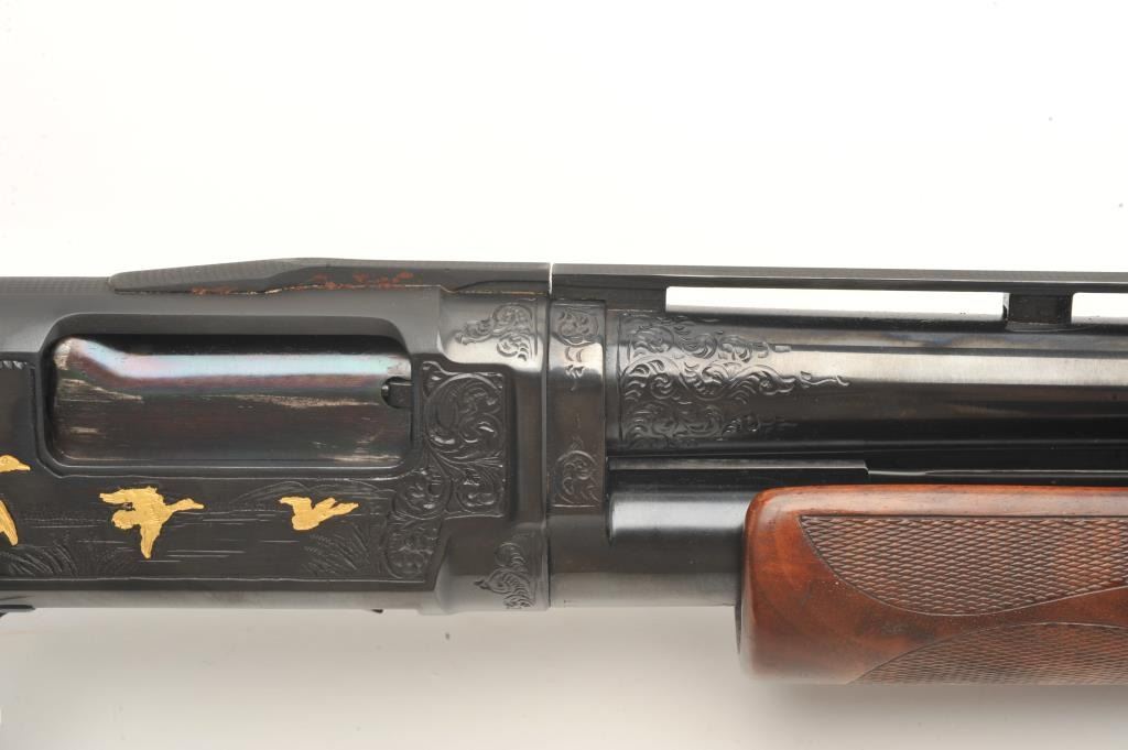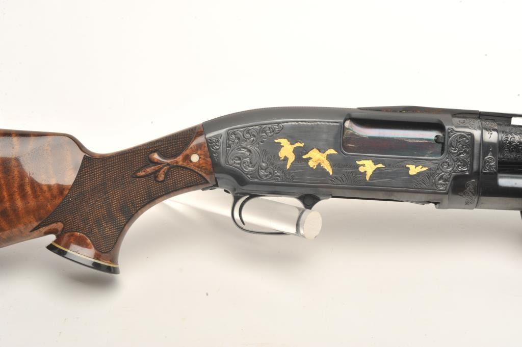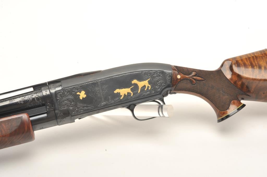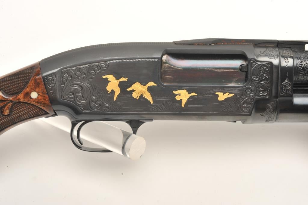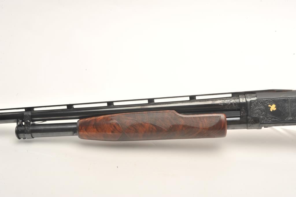 Custom Winchester Model 12 Trap pump action, takedown shotgun, 12 gauge, 30” ventilated rib barrel, custom engraved and gold inlaid, blued finish, checkered deluxe wood stocks with beautiful graining, S/N 1105492, inoverall very good to fine condition as customized; fine bore, crisp action, beautifully checkered and flame grained special wood stocks. (Modern). Est.: $300-$600.