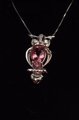 Lot 866 One 18k white gold owl shaped pendant set with a 5ct Pink tourmaline and diamonds Est:$750-1,000