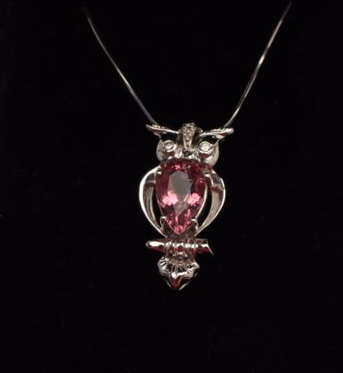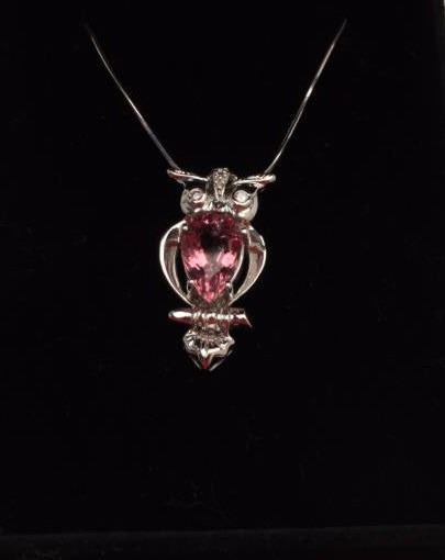 One 18k white gold owl shaped pendant set with a 5ct Pink tourmaline and diamonds Est:$750-1,000