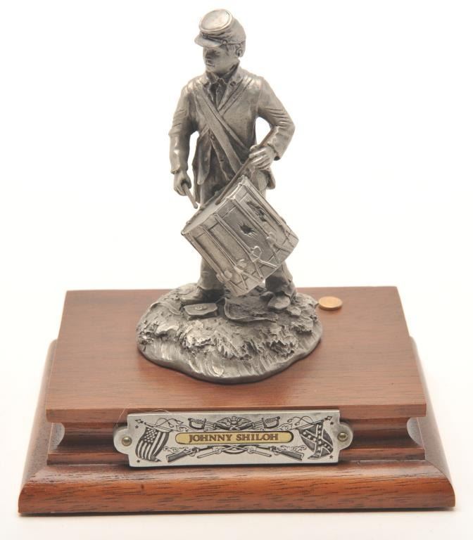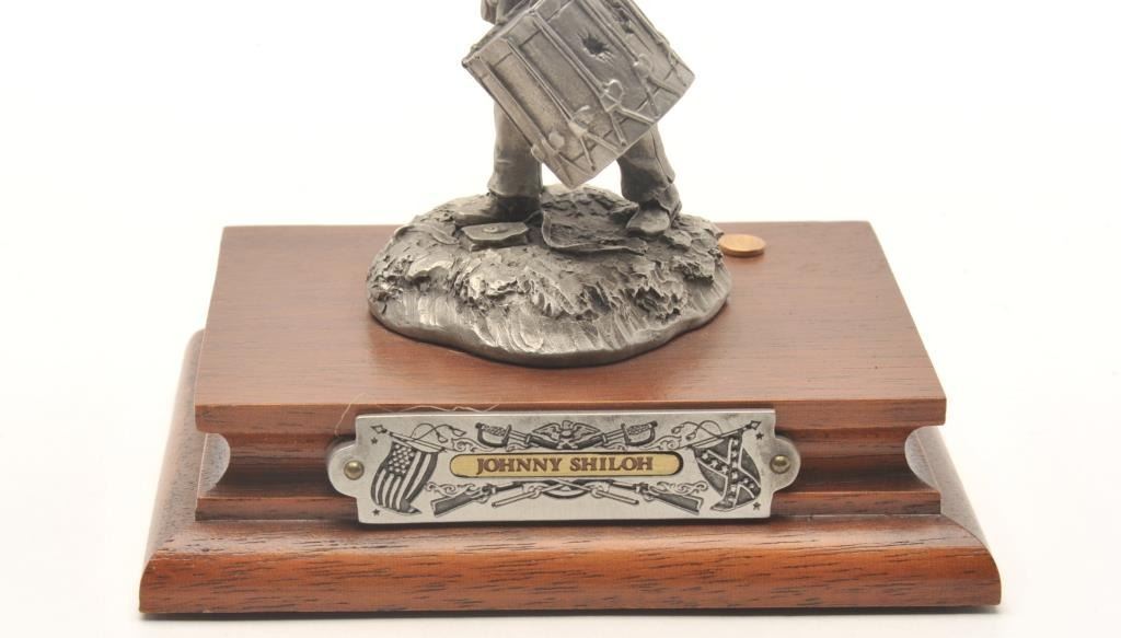 Pewter sculpture by Fran Barnum and issued by Chilmark Collectors Society entitled “Johnny Shiloh”, #007/2500, approximately 4.5” in height including wood base with Certificate of Registration, signed and dated Apr. 25,1988. Est.: $100-$200.