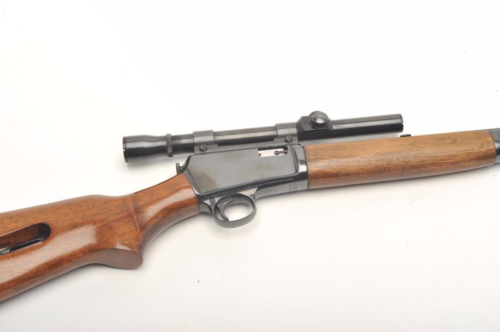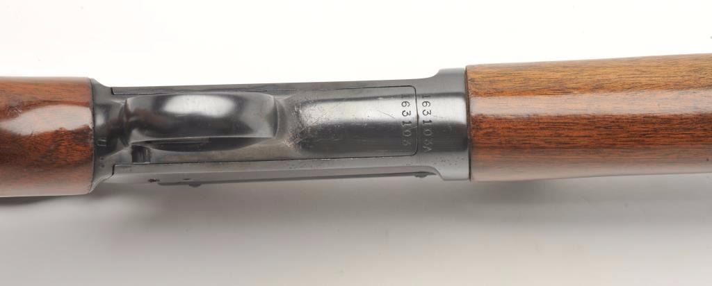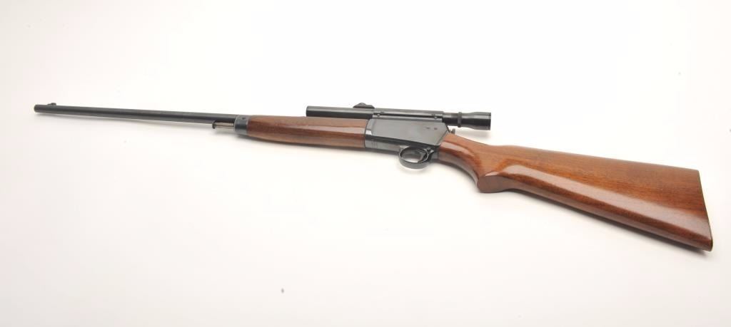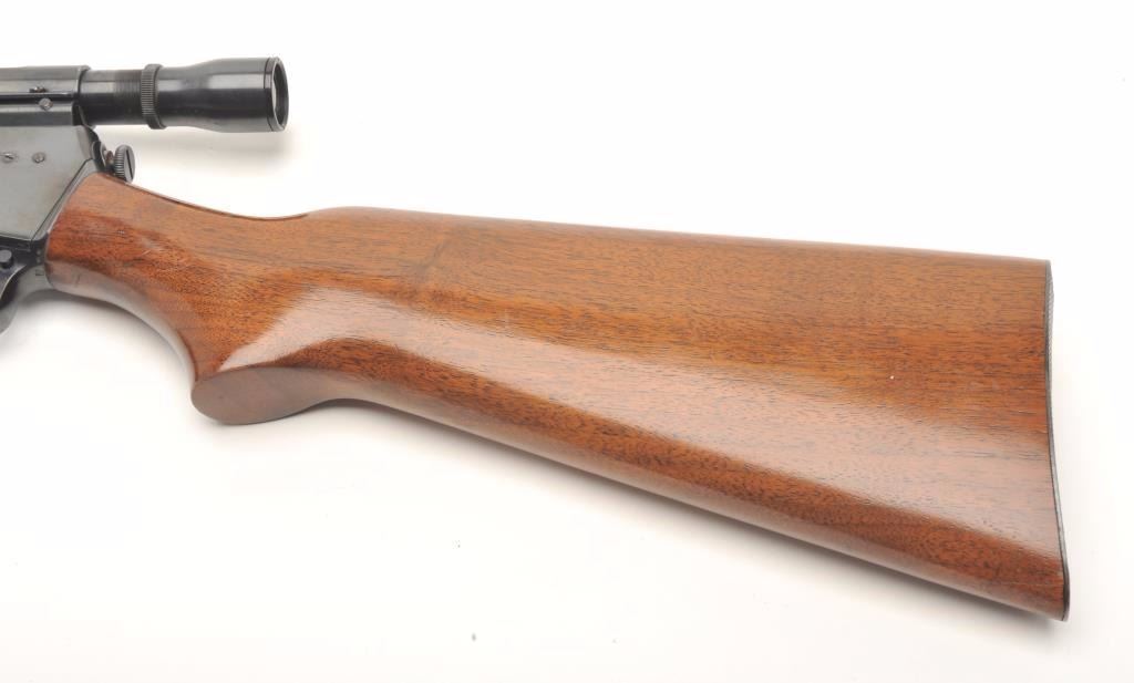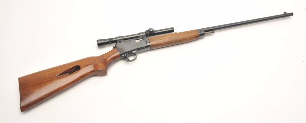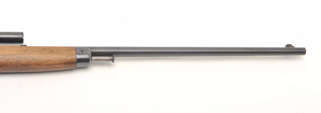 Winchester Model 63 semi-auto rifle, .22 Long Rifle caliber, serial #163103A. The rifle is in very good overall condition with a 23” round barrel. The barrel and receiver retain the majority of their blued finish with only storage marks noted. The rifle has been topped with a Weaver one-piece mount and Weaver J2 2.5x power fixed scope. The smooth wood stocks are in very good condition with only light handling marks. The butt stockends with a checkered steel butt plate. The bore is very good, the action crisp and the markings are sharp. (Modern) Est.: $300-$600.