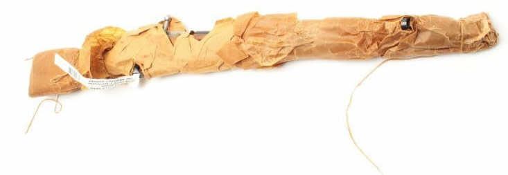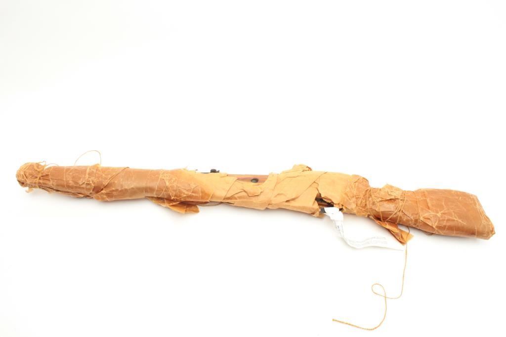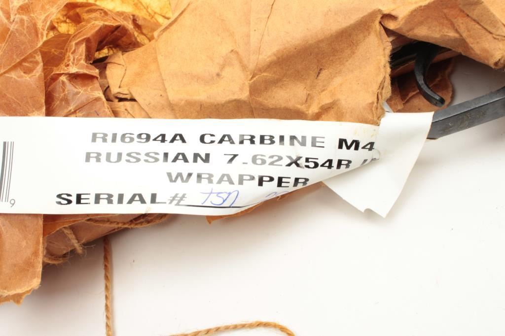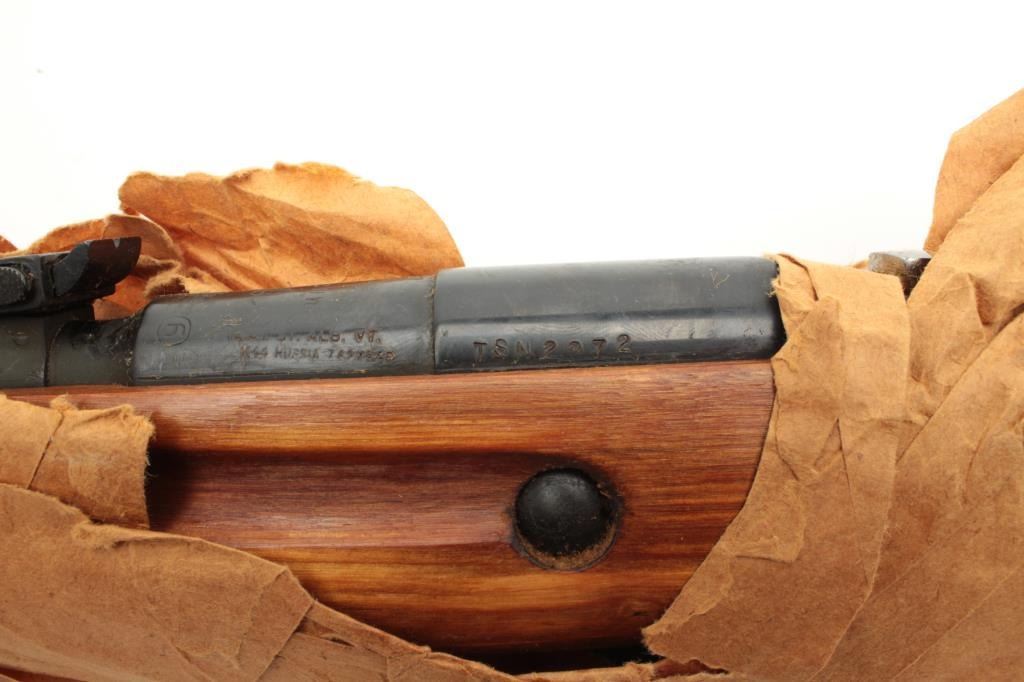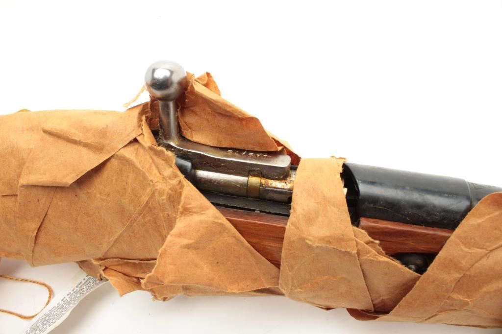 Russian Model 44 Mosin-Nagant carbine, 7.62 x54R caliber, serial #TSN2972. The carbine is still in packing grease, wrapped in brown paper and in the original shipping box with all associated paperwork. The action isdated 1946 and includes the Russian crest on the front ring. The carbine has the proprietary bayonet as well. You don’t see many still in the grease anymore. (C+R) Est.: $150-$300.