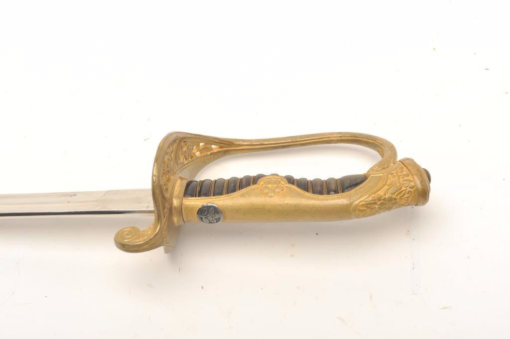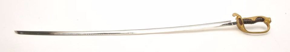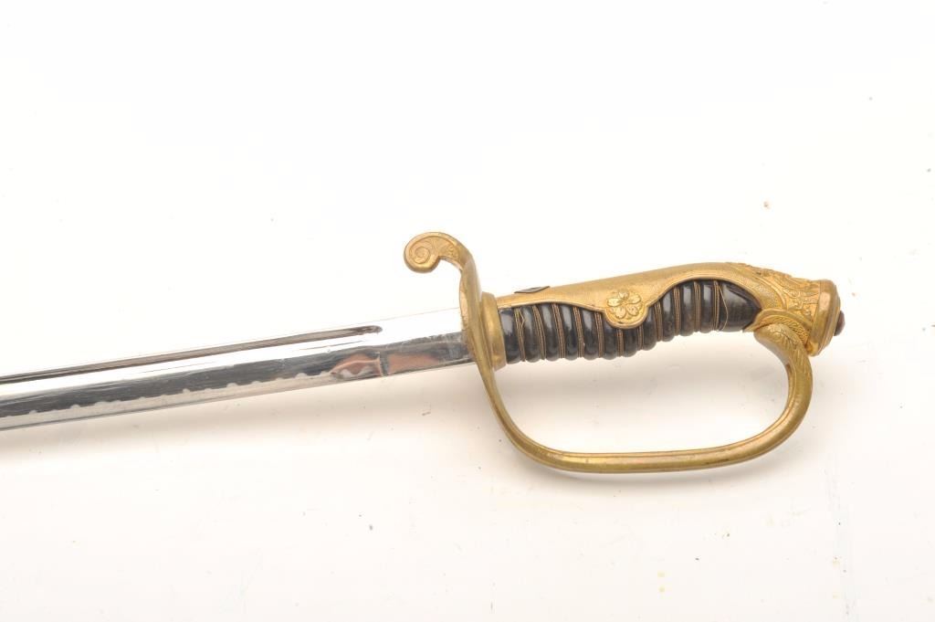 Japanese Officers sword without scabbard. The sword is in good overall condition and measures 37 ½” in total length with a 32 ½” blade. The blade has been sharpened and shows small dents to the edge. The handle is cast metal with a gold tone finish featuring a wire wrapped plastic grip. Est.: $75-$150.