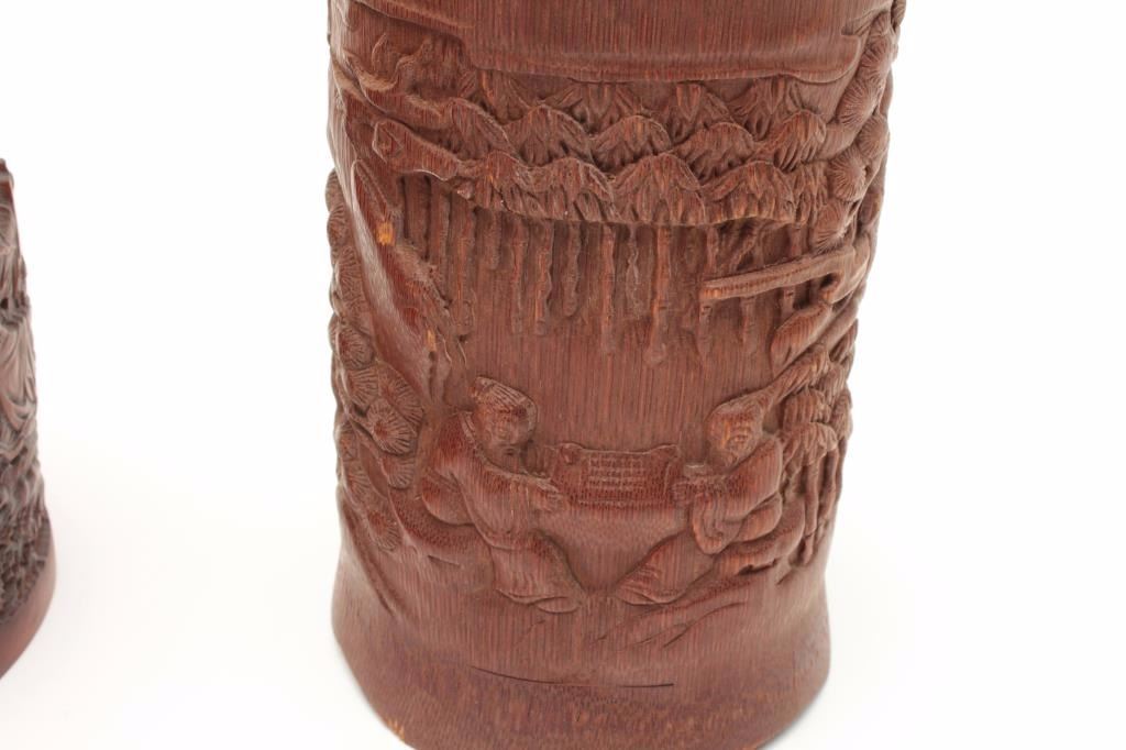 Lot of four 19th century Japanese brush holders crafted from carved bamboo. The lot includes four brush holders all between 6 ½”-7” in height. Each item is beautifully hand carved in relief, depicting Japaneselife. The holders are all in very good condition with only storage wear noted. Est.: $100-$200.