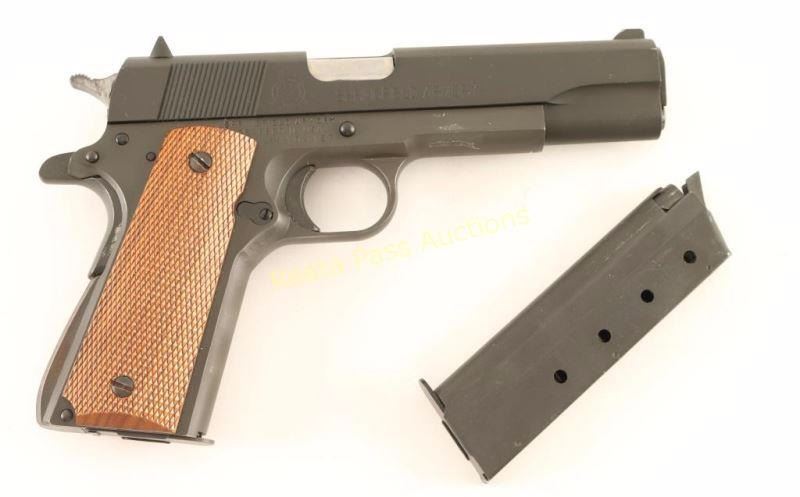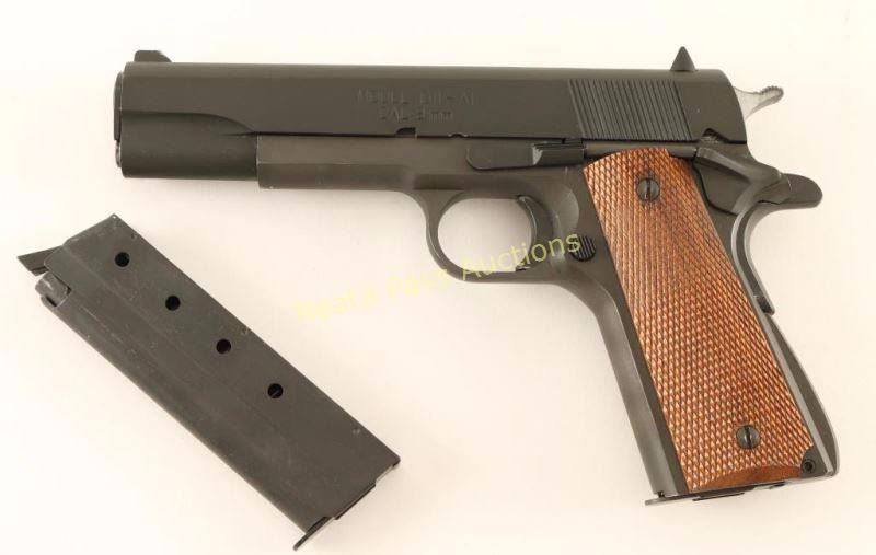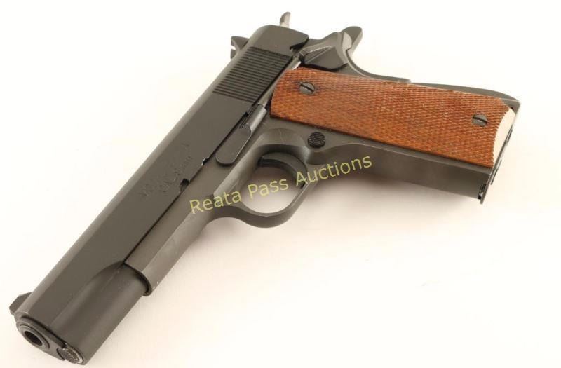 American made 1911-A1 style single-action semi-automatic pistol chambered in 9x19mm. Features a matte black/dark grey dual tone finish, 5" barrel, three-dot sights, steel frame, serrated trigger, serrated hammer spur, thumb safety, beavertail grip safety, push button magazine release, 9 round magazine, serrated arched mainspring housing, and two piece checkered wood grips. Includes a spare magazine. Pistol exhibits approximately 97% of it's original finish showing very little wear and light scattered handling marks. Action is smooth, bore is pristine and wood grips are very good with 1.2" of worn checkering on the left panel under the top screw. Condition is near excellent. ***Modern Firearm***